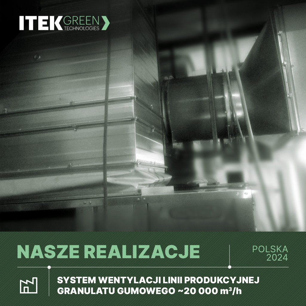 Realizacja projektu w zakresie „Zaprojektuj i Wybuduj”. Wykonanie systemu wentylacji linii produkcyjnej granulatu gumowego z procesu recyklingu zużytych opon. Wydajność systemu wentylacji ~ 20 000 m3/h.